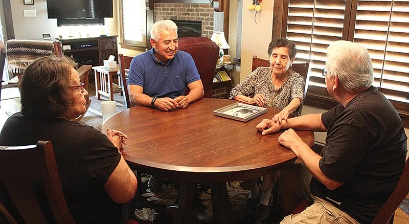 The family of Marie Mendoza recently gathered at the home of Faustino and Rita Mendoza to reminisce about family life and the fiesta. Pictured from left are: Rita Mendoza, Ronnie Barron, Juanita “Jennie” Barron and Faustino Mendoza. LEAVEN PHOTO BY MARC ANDERSON