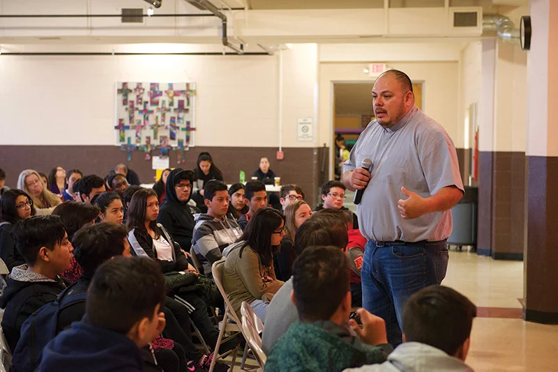 Deacon Frank Moreno of Grand Island, Nebraska, speaks to a packed house at the first-ever Cathedral of St. Peter bilingual youth retreat on March 24. LEAVEN PHOTO BY JOE MCSORLEY