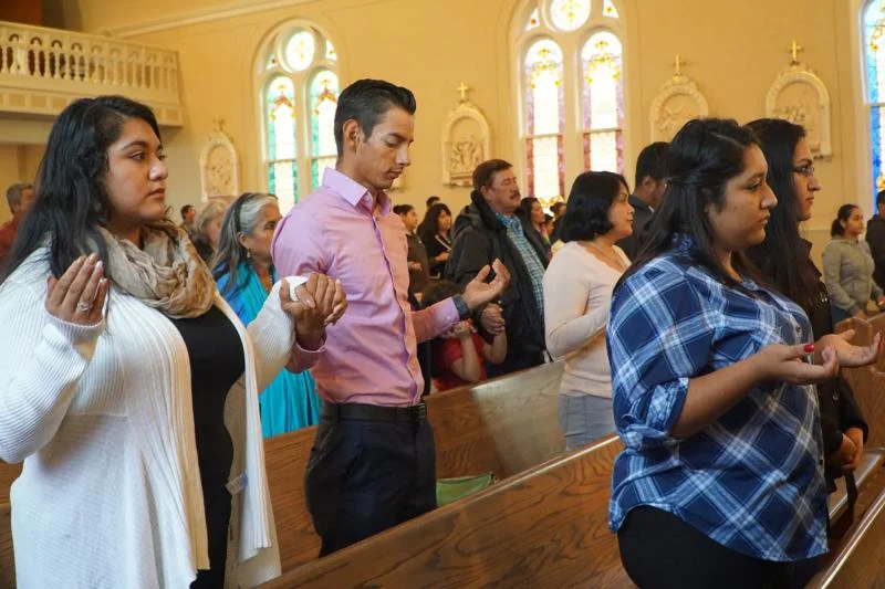Young Hispanics, including Mirna Lozano, Carlos Guzman and Dora Lozano, front right, recite the Lord’s Prayer during a young adult Mass in late October at St. Dominic Church in Springfield, Ky. The three young people are among 800,000 young people nationwide currently protected by the Deferred Action for Childhood Arrivals program, or DACA. (CNS photo/Ruby Thomas, The Record)