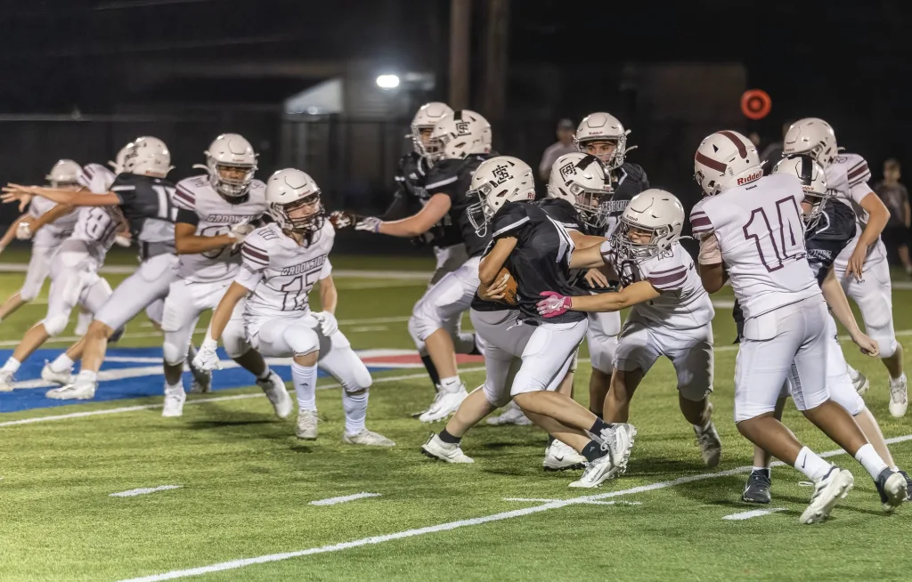 The CYO Shawnee Catholic football team competes against the Brookside CYO football team during an evening game at Bishop Miege High School in Roeland Park. LEAVEN PHOTO BY DOUG HESSE