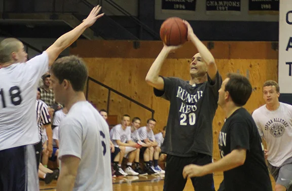 Father John Schmeidler, OFM Cap., pastor of St. John the Evangelist Parish in Lawrence, attempts a three-point shot during the Runnin’ Revs basketball game April 22 at Hayden High School in Topeka. The game featured grade school and high school students playing basketball against archdiocesan priests and seminarians to raise money to help seminarians with expenses. The game raised $1,253.