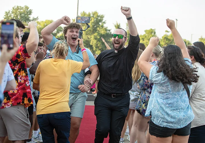 Father Colm Larkin, chaplain at St. Thomas Aquinas High School in Overland Park, takes part in the annual freshmen red carpet welcome, where the students were greeted by faculty and seniors as they arrived for orientation. LEAVEN PHOTO BY JAY SOLDNER