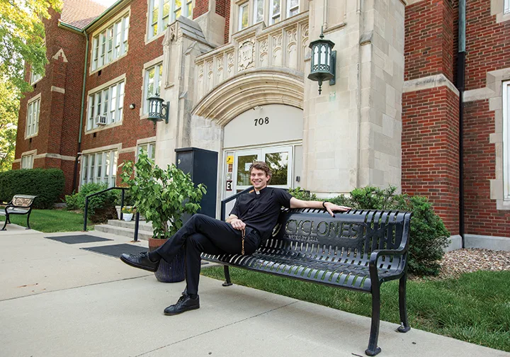 Chaplain Father Timothy Skoch takes a break on the Cyclones bench in front of Bishop Ward High School in Kansas City, Kansas, as he awaits the students’ return. Father Skoch is at the school three-and-a-half days a week, where, among many other things, he will celebrate one class Mass a week and on Fridays lead “Jesus and Java” before school starts. LEAVEN PHOTO BY JAY SOLDNER