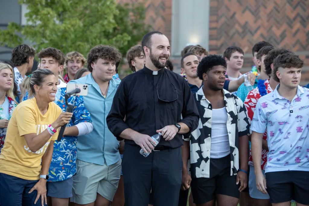 After Mass, Father Larkin participated in the annual freshmen red carpet welcome, where the students were greeted by faculty and seniors as they arrived for orientation.