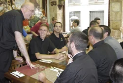 Archbishop Joseph F. Naumann spends some time with seminarians before a meal in Madrid. Pictured clockwise from left are: Justin Hamilton, Dan Morris, David Pratt, Father Bill Bruning, and Nathan Haverland.