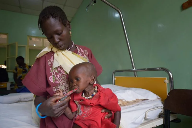 Ajok Uogu feeds her 2-year old daughter, Awok, a nutritional supplement April 26 in St. Daniel Comboni Catholic Hospital in Wau, South Sudan. Drought and armed conflict have pushed tens of thousands of Wau-area residents out of their homes, away from their farms and unable to adequately feed themselves. (CNS photo/Paul Jeffrey)