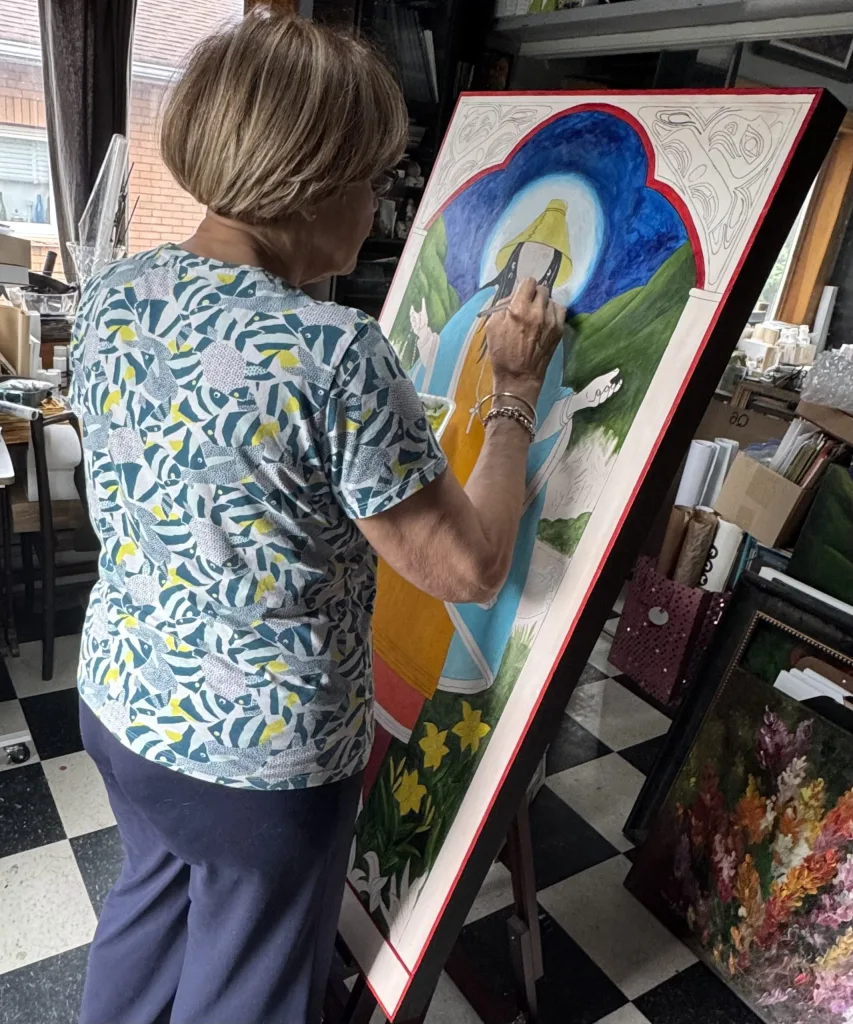 “Every time I come into my studio, I start with a prayer. I pray over my brushes. I pray over my paint. And, in the case of a saint, I pray to the saint,” she said. “I ask the saint to guide me to select the colors that the saint would want, to put the saint in a setting where the saint would want to be, and I ask the saint to speak to my heart, tell my heart what you want my hands to do.”