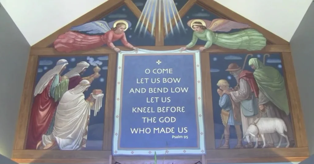 A richly colored mural of shepherds, wise men and angels beams down into the narthex over the church doors, which really gives people the feeling that they’re in the church of the Nativity, said Samuelson.