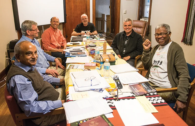 The “universal brotherhood” of Jesus Caritas is reflected in its International Council, which met in Kansas City, Kansas. They are, clockwise, from left, Father Emmanuel Asi from Pakistan, Jean-Francois Berjonneau from France, Father Mark Mertes from the archdiocese, Father Aurelio Sanz from Spain, Father Mauricio Da Silva Jardim from Brazil, and Father Rajaonarivelo Felix from Madagascar. LEAVEN PHOTO BY JOE BOLLIG