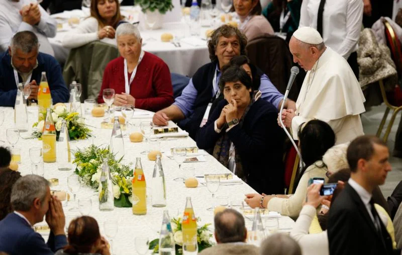 Pope Francis leads grace before eating lunch with the poor in the Paul VI hall after celebrating Mass marking the first World Day of the Poor at the Vatican Nov. 19. Some 1,200 poor people joined the pope for the meal. (CNS photo/Paul Haring)