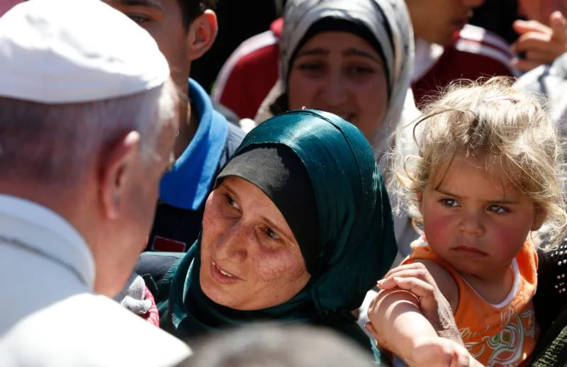 Pope Francis meets refugees at the Moria refugee camp on the island of Lesbos, Greece, April 16, 2016. (CNS photo/Paul Haring)