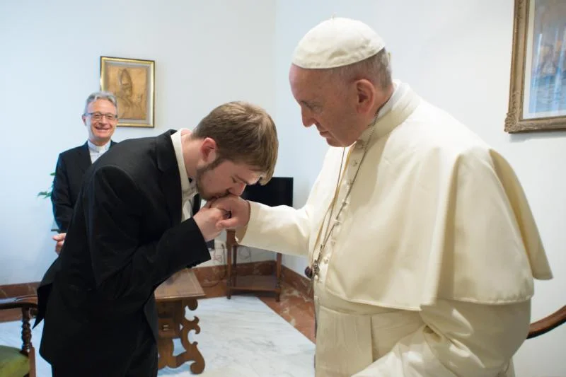 Tom Evans, father of the seriously ill child Alfie Evans, kisses Pope Francis’ hand during a private audience in the Domus Sanctae Marthae at the Vatican April 18. Evans pleaded for “asylum” for his son in Italy so he may receive care and not be euthanized in England. Italy granted asylum April 23. (CNS photo/Vatican Media)