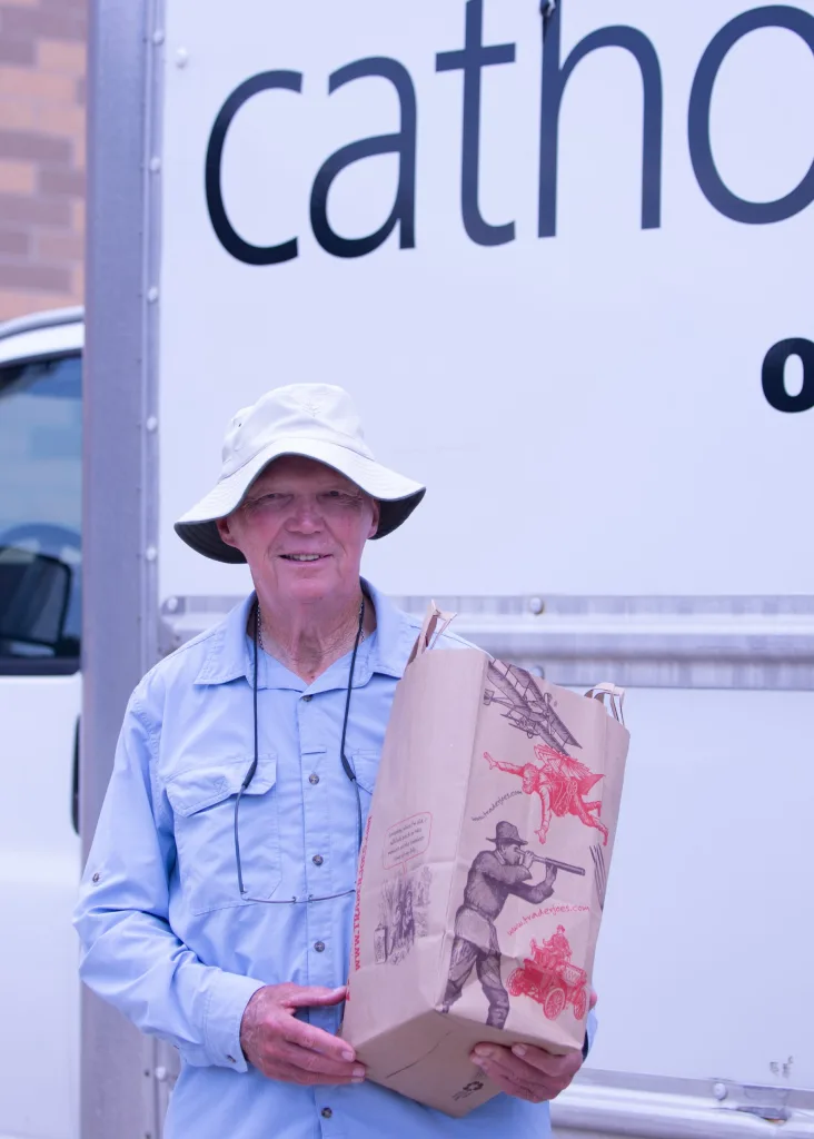 He also helps with the monthly food drive for Catholic Charities, picking up the donation truck, helping load donations and delivering them back to Catholic Charities.