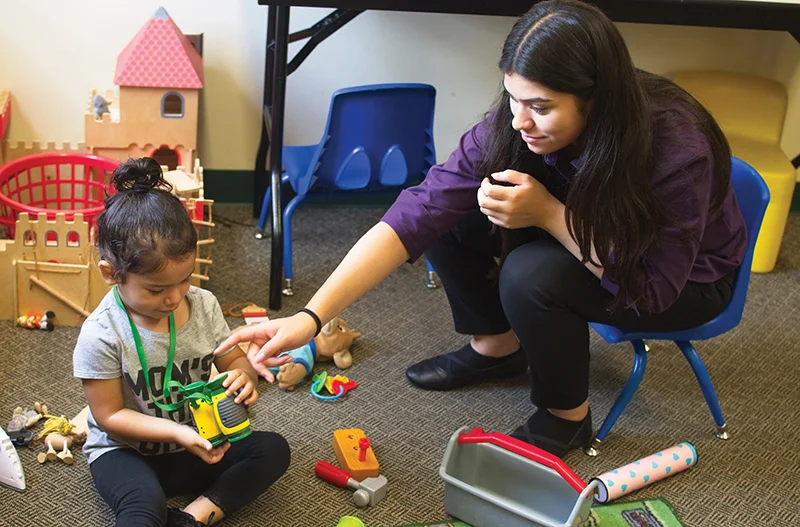 Cristo Rey student Alondra Estrada finds being bilingual is helpful in her work at Keeler Women’s Center, especially when she cares for participants’ children. LEAVEN PHOTO BY JILL RAGAR ESFELD