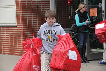 PHOTO BY HEATHER SULLIVAN Tate Rowland, an eighth-grader at St. Ann School in Prairie Village, hauls bags of gifts to load in a truck to deliver for Christmas to children in the foster care system. Working with the Red Bag Program has been an Advent tradition at St. Ann for decades.