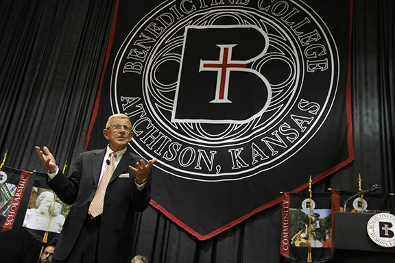 ATCHISON — Legendary football coach, author and broadcaster Lou Holtz visited the campus of Benedictine College here on Aug. 28 to deliver the keynote address at the school’s opening convocation. Following an all-school Mass celebrated by Archbishop Joseph F. Naumann, a crowd of nearly 1,400 filled the Ralph Nolan Gymnasium for the opening academic event of the year. With jokes, magic, and heartfelt comments, Holtz captivated the audience with his advice on how to live a positive and fulfilling life.
