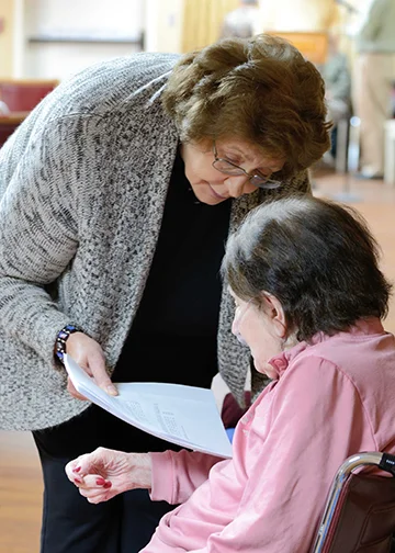 LEAVEN PHOTO BY JILL RAGAR ESFELD Before the monthly Mass begins at Garden Terrace Alzheimer’s Center in Overland Park, Dawn Malis, a member of the Good Shepherd Parish Caring Ministry, hands out music sheets to residents who want to join in singing with the volunteers.