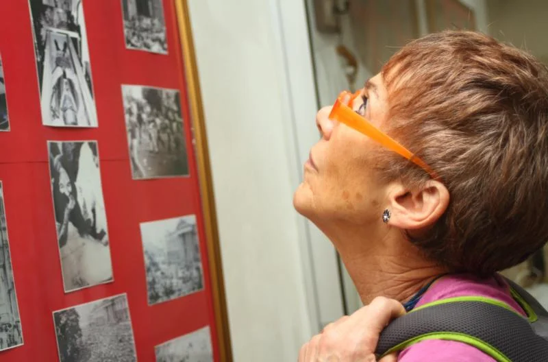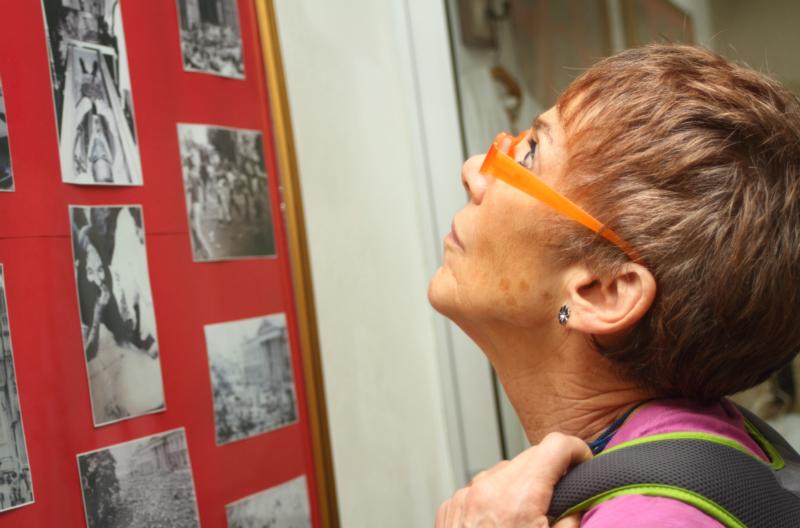 Una delegada estadounidense observa fotos el 30 de noviembre en un museo dedicado al finado arzobispo salvadoreño Oscar Romero en San Salvador. Activistas estadounidenses visitaron El Salvador para asistir a un servicio conmemorativo por el aniversario 35 de los asesinatos de cuatro eclesiásticas cometidos el 2 de diciembre de 1980. (Fotos CNS-Edgardo Ayala)