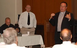 Deacon Dana Nearmyer (right), lead archdiocesan consultant for evangelization and Catholic formation of youth, and Rick Cheek, consultant with the office of evangelization and Catholic formation of youth, discuss the challenges the archdiocese faces in reaching rural and urban youth — as well as a plan to meet those challenges — with the case review task force July 19 at Savior Pastoral Center.