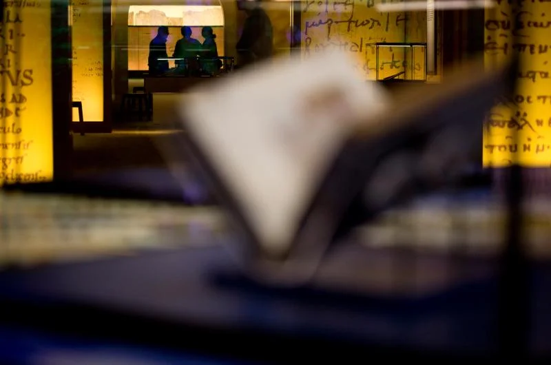 People stand near a bound book and biblical codices inside the “History of the Bible” exhibit at the Museum of the Bible in Washington Nov. 15. (CNS photo/Tyler Orsburn)