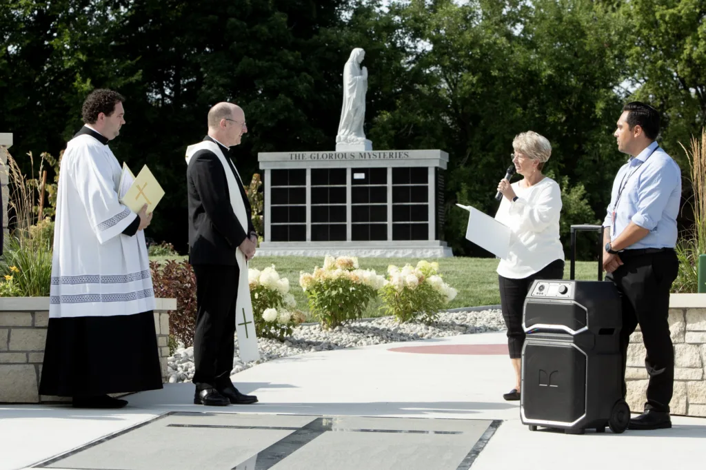 In her opening remarks, Sharon Vallejo, president of Catholic Cemeteries of Northeast Kansas, described special features of the rosary garden that guests viewed during the procession. These include large stamped red circles on the path that winds through the garden, representing beads of the rosary.
