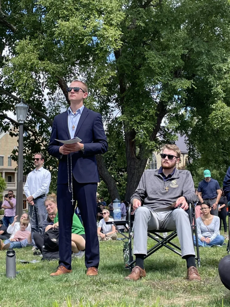 Father McCormick then introduced the rally’s keynote speaker, Alex Jones, CEO and co-founder of the Hallow App, an American Catholic meditation and prayer app. Jones, a 2015 Notre Dame graduate, told the crowd about his own faith journey, a journey that began with bleak assumptions about prayer.