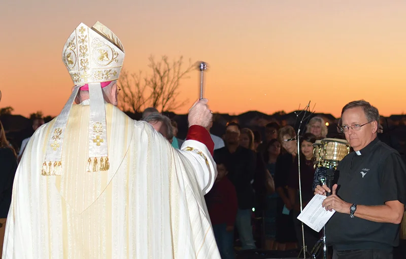 With the sun setting, Archbishop Joseph F. Naumann, assisted by pastor Father Michael Hermes, blesses the ground at 115th Terrace and Lone Elm Road in Olathe, where St. Paul Church and School will be relocated. LEAVEN PHOTO BY JILL RAGAR ESFELD