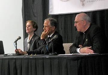 Archbishop Joseph Naumann, Dr. John Haas, president of the National Catholic Bioethics Center, and Karen McCleese, a lawyer and vice president of regulatory affairs for CBIZ, a Kansas City employee benefits specialist, laid out the ethical and legal landscape and took questions from the audience of about 200.