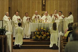 Father Pat Sullivan, at the time parochial administrator of St. Joseph in Lillis, celebrates Mass with several former pastors of the parish. Concelebrating with Father Sullivan are: (from left) Father Carl Dekat, Father David Smith, Father George Seuferling, Father Bob Hasenkamp, Father Mike Stubbs (partially blocked), Father Phil Winkelbauer, Father Jim Shaughnessy, and Father Arul Carasala.