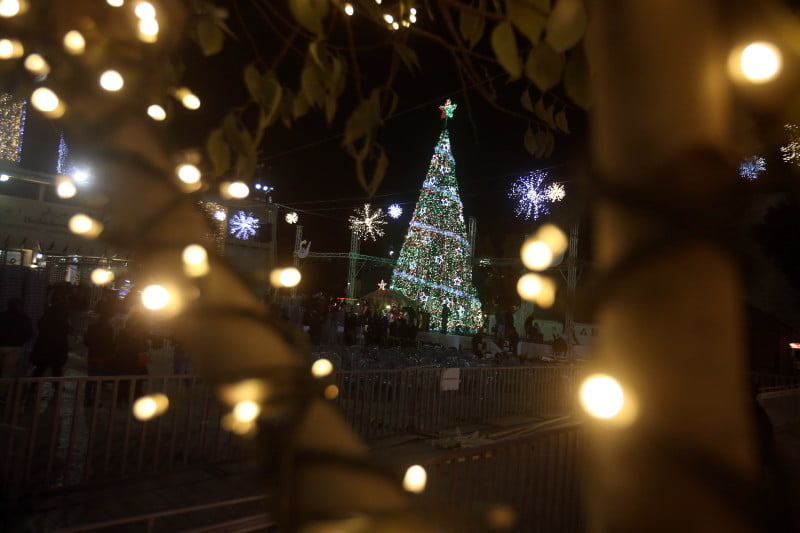 People attend the lighting of the Christmas tree on Manger Square in Bethlehem, West Bank, Dec. 5. Latin Patriarch Fouad Twal urged a more spiritual celebration of Christmas this year and called for an end to the arms trade. (CNS photo/Abed Al Hashlamoun, EPA)