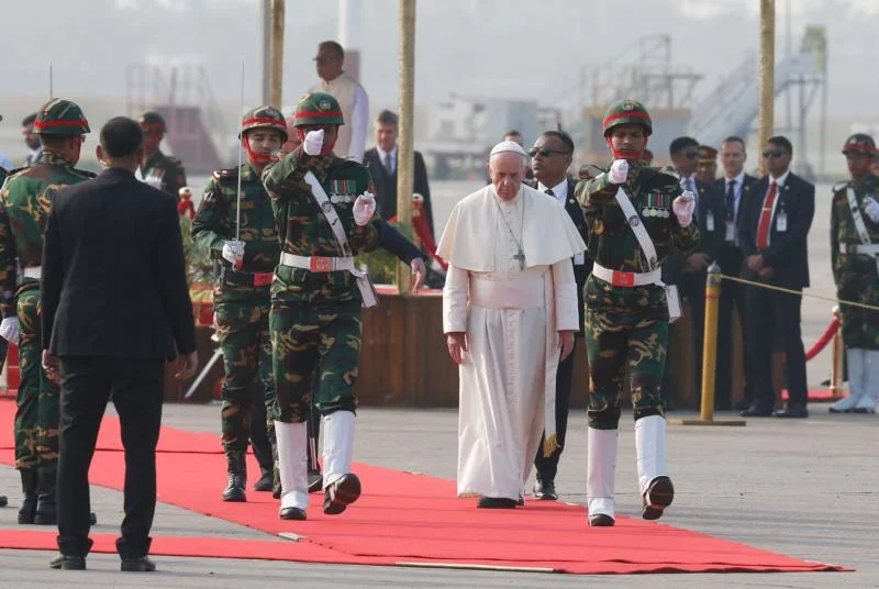 Pope Francis walks with an honor guard as he arrives at the international airport in Dhaka, Bangladesh, Nov. 30. (CNS photo/Paul Haring)