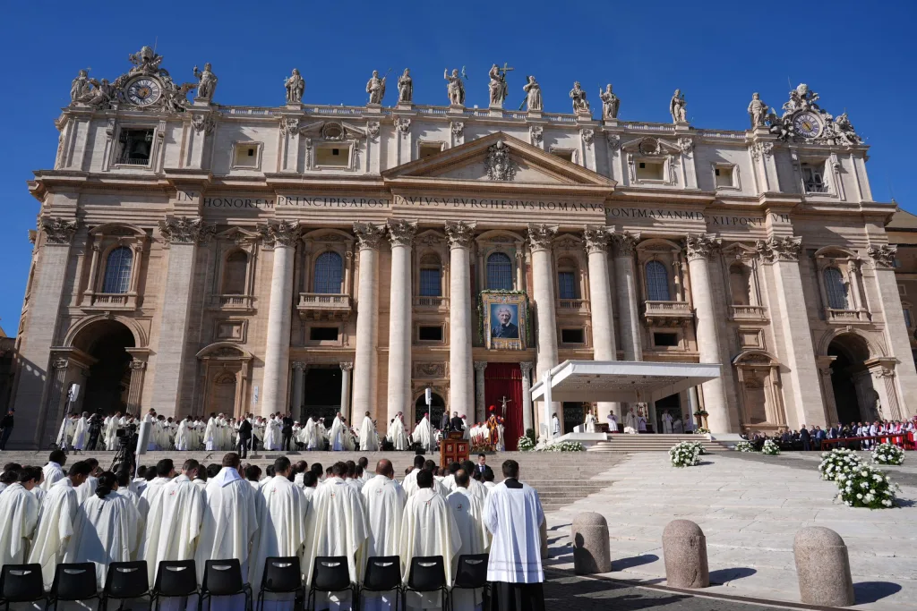 A tapestry of St. John Henry Newman hangs from the facade of St. Peter’s Basilica at the Vatican Nov. 1, 2025, during the Mass in which Pope Leo XIV declared the 19th-century English cardinal and theologian a doctor of the church. The liturgy concluded the Jubilee of the World of Education. (CNS photo/Lola Gomez)