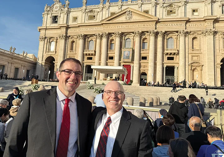 Matthew Muller (left) of Benedictine College in Atchison and Brian Hughes of the University of St. Mary in Leavenworth stand in St. Peter’s Square for the liturgy to celebrate the elevation of St. John Henry Newman to the status of doctor of the universal church. COURTESY PHOTO