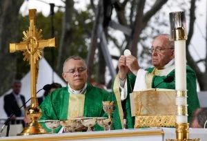 Pope Francis raises the Eucharist as he celebrates the closing Mass of the World Meeting of Families on Benjamin Franklin Parkway in Philadelphia Sept. 27. With him at the altar is Philadelphia Archbishop Archbishop Charles J. Chaput. (CNS photo/Paul Haring)