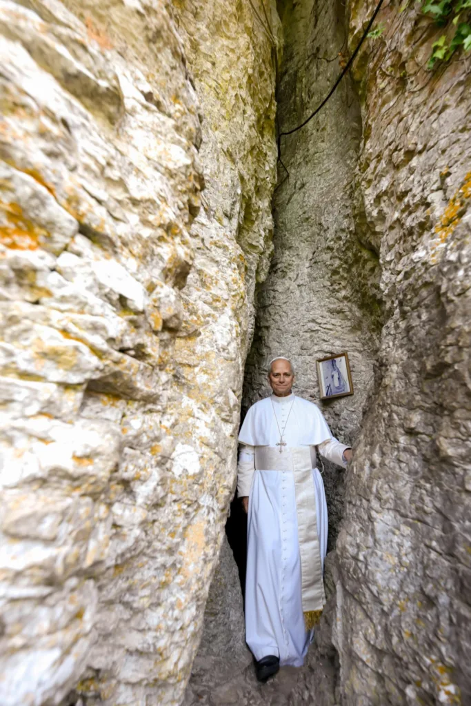 Pope Leo XIV walks through a passage after leaving the Cave of St. Benedict at the Shrine of Our Lady of Grace of Mentorella near Guadagnolo, Italy, Aug. 19, 2025. Above his shoulder is a photo of St. John Paul II walking out of the cave during a visit in 1978. (CNS photo/Vatican Media)
