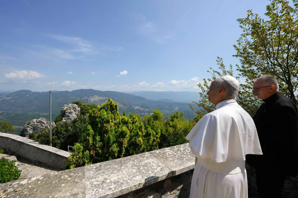 Pope Leo XIV looks out over the central Italian countryside from from the Shrine of Our Lady of Grace of Mentorella near Guadagnolo, Italy, Aug. 19, 2025. Standing next to him is Resurrectionist Father Adam Dzwigon, rector of the Shrine of Our Lady of Grace of Mentorella. (CNS photo/Vatican Media)