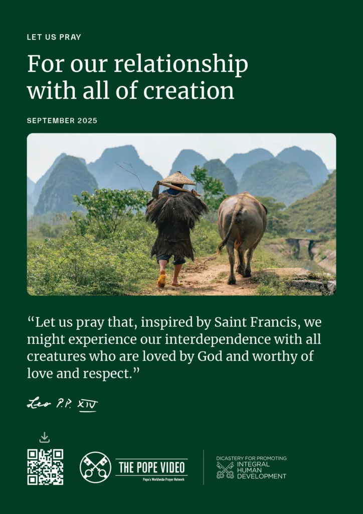 Pope Leo XIV’s prayer intention for the month of September is: “For our relationship with all of creation.” The pope’s prayer and a video to accompany it was released by the Pope’s Worldwide Prayer Network Sept. 2, 2025. (CNS photo/Pope’s Worldwide Prayer Network)