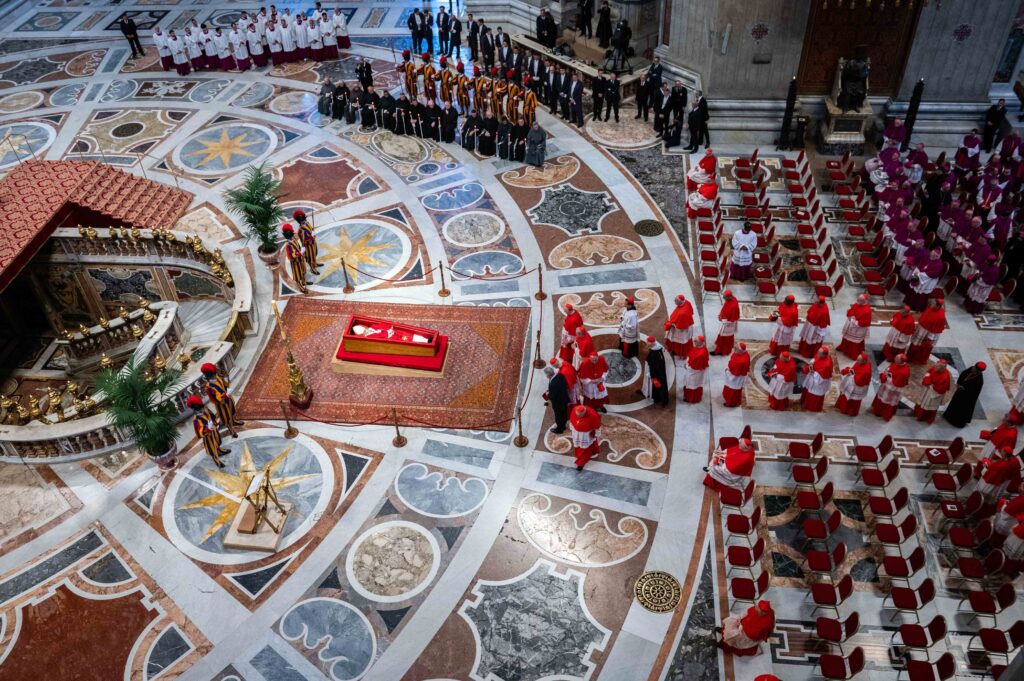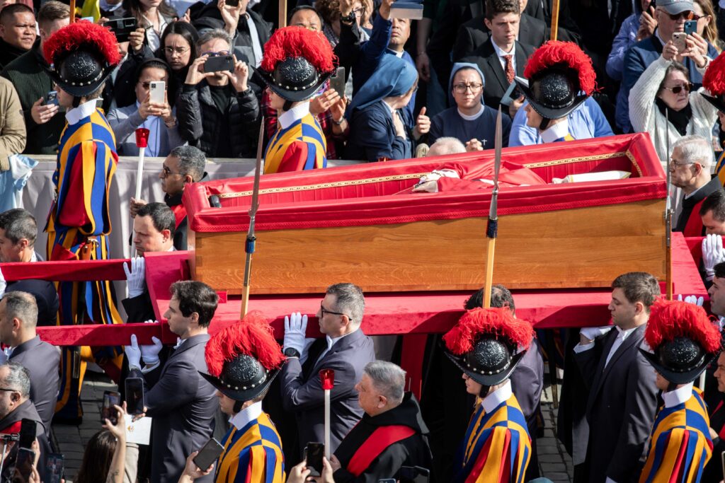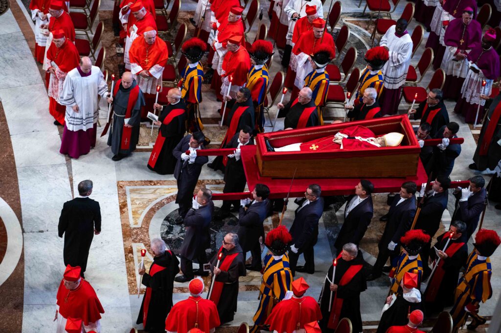Pope Francis’ body, in a zinc-lined wooden casket covered in red fabric, was placed before the main altar on a low platform cut at an angle so that people coming to pay their respects could see his face.