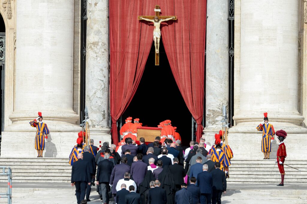 More than 80 cardinals joined the procession ahead of Cardinal Farrell, who was wearing a red and gold cope, and immediately preceded the pallbearers flanked by members of the Pontifical Swiss Guard.