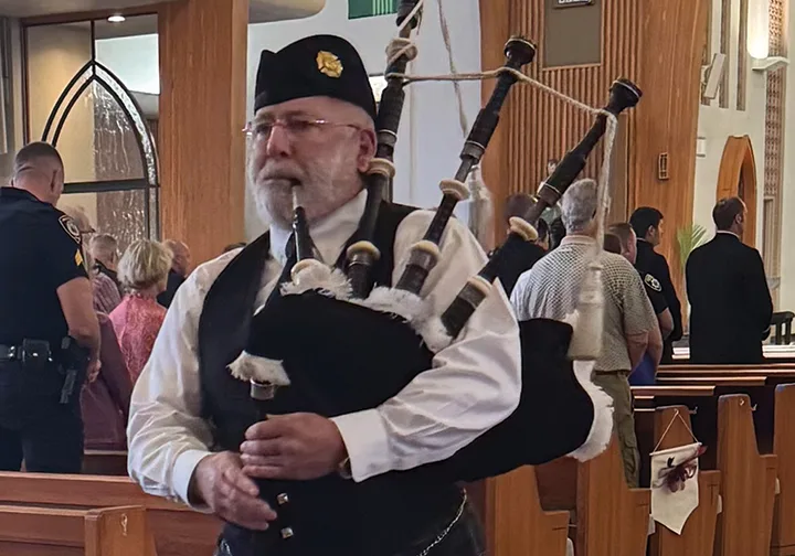 Following the final blessing, the color guard processed out to “Amazing Grace” played on the bagpipes. A luncheon was provided by the Knights of Columbus for the first responders, their families, the congregation and the middle school students from John Paul II School.