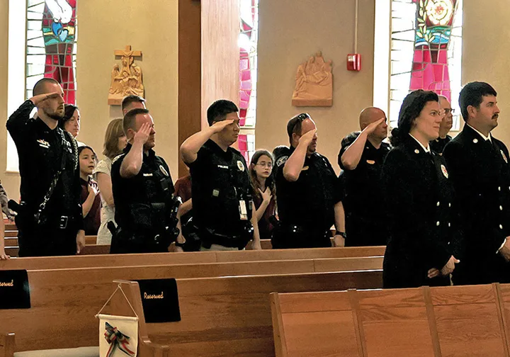 The Mass was celebrated by Father Bruning; police chaplain Deacon Lee Butler, of Curé of Ars Parish in Leawood, assisted. The liturgy was marked by symbols of both faith and service. An honor guard processed in with the American flag and flags of each department, patriotic banners marked the pews, and red, white and blue flowers were displayed at the altar.