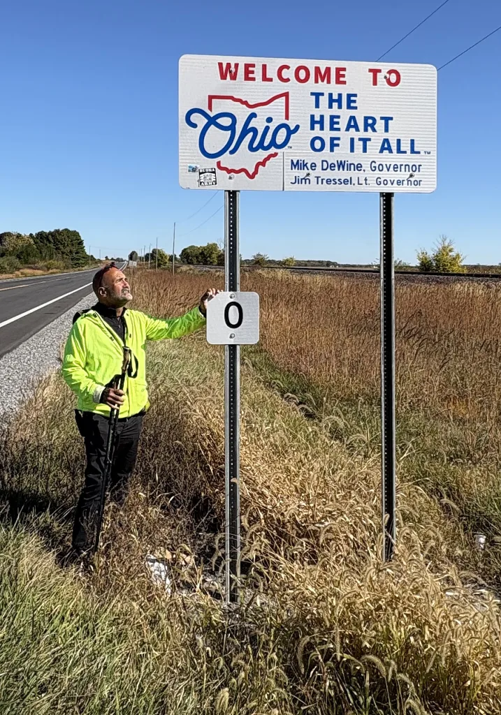 Father Gary Graf, pastor of Our Lady of the Heights Parish in the Chicago suburb of Chicago Heights arrives near the Ohio state line during his 50-day pilgrimage on foot from Chicago to New York to highlight the upheaval immigrant families are experiencing under the current immigration crackdown. Edgerton, Ohio, Oct. 16, 2025. (OSV News photo/courtesy Olivia Erbach)