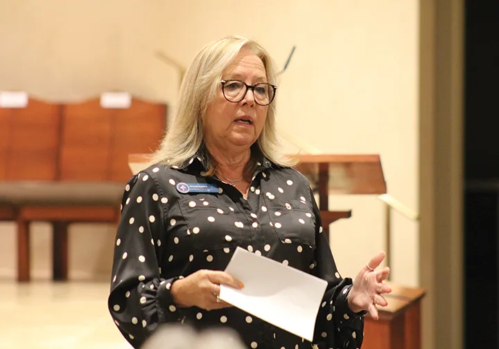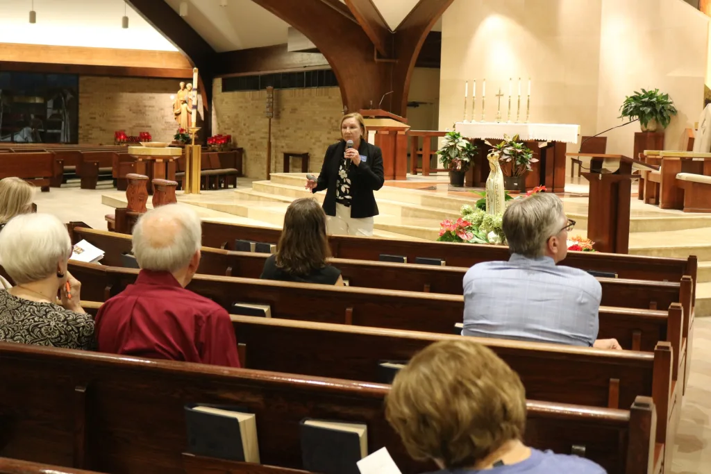 Denise Ogilvie, chief mission integration officer at Catholic Charities of Northeast Kansas, presents during the pro-life speakers’ event at Holy Spirit Church in Overland Park on Oct. 16. LEAVEN PHOTO BY MARC ANDERSON