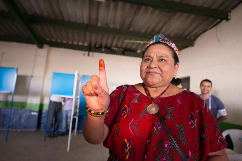 Rigoberta Menchú, ganadora del Premio Nobel, muestra su dedo manchado con tinta después de depositar su voto en un aula eleccionaria en Ciudad de Guatemala durante las elecciones generales del 6 de septiembre. (Foto CNS/Esteban Biba, EPA)