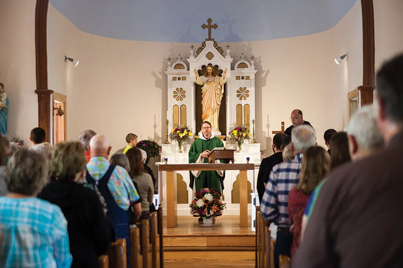 Father Jeremy Heppler, OSB, celebrates Mass at the renovated St. John Oratory in Doniphan. The church had fallen into disrepair. The renovation was made possible by the Friends of St. John Oratory, a group of community members dedicated to seeing the church restored. LEAVEN PHOTO BY LAURENCE ROSSI