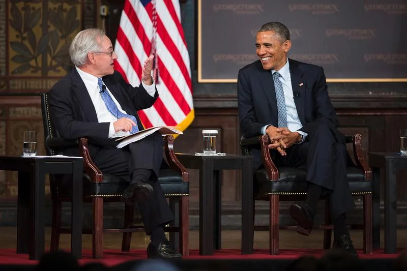 U.S. President Barack Obama shares a light moment with E.J. Dionne Jr. of the Brookings Institution May 12 during the Catholic-Evangelical Leadership Summit on Overcoming Poverty at Georgetown University in Washington. CNS photo by Tyler Orsburn.
