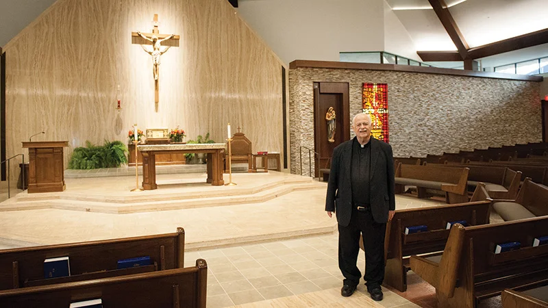 Father Charles McGlinn, pastor of Curé of Ars Parish in Leawood, stands near the renovated sanctuary. The top-to-bottom renovation includes new pews, flooring, lighting, heating, air conditioning, sound system, choir area, paint and Stations of the Cross. Photo by Lori Habiger.
