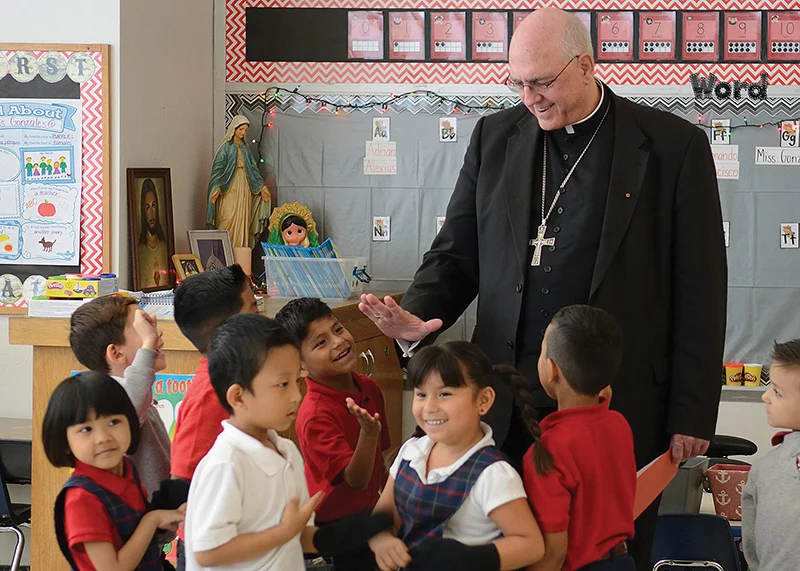 Archbishop Joseph F. Naumann high-fives kindergarten students at Resurrection School at the Cathedral during a tour of the school. Resurrection was recently named the Catholic Education Foundation School of Excellence for the fourth time. Currently, 1,400 students receive CEF scholarships. LEAVEN PHOTO BY JILL RAGAR ESFELD