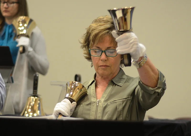Handbell ringers, regardless of their level of experience, move and work together, learning first how to ring the bell and then learning technique.