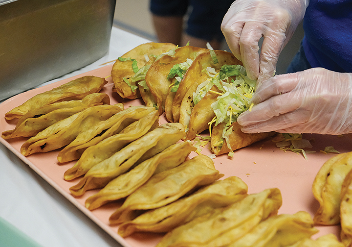 Once the tacos are ready to fry the day of the supper, volunteers pull the toothpicks out and stuff the tacos with lettuce and cheese. They’re served with fresh rice, chips, salsa and dessert.